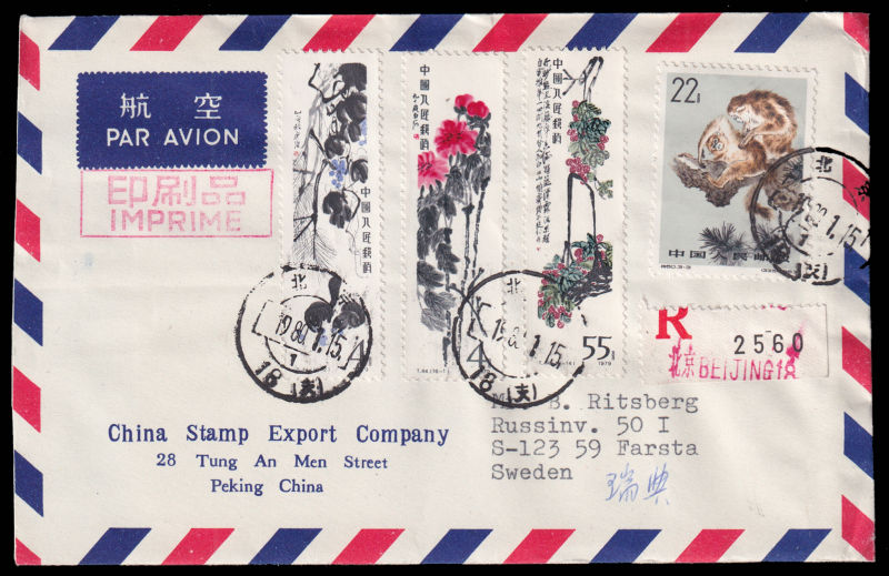 614 FDC Mi:1565-66,1578, SG:2939-40,2952 image1980 Paintings of Qi Baishi on official cover sent by registered airmail of China Stamp Export Company on first day of issuring to Sweden, additionally franked with S60(3-3). VF with original documents included. 1980 T44(16-1,16-2,16-14)北京总公司公文封首日航空挂号寄瑞典, 加贴特60(3-3).带原始函件. (Image) (image11) (All Images)