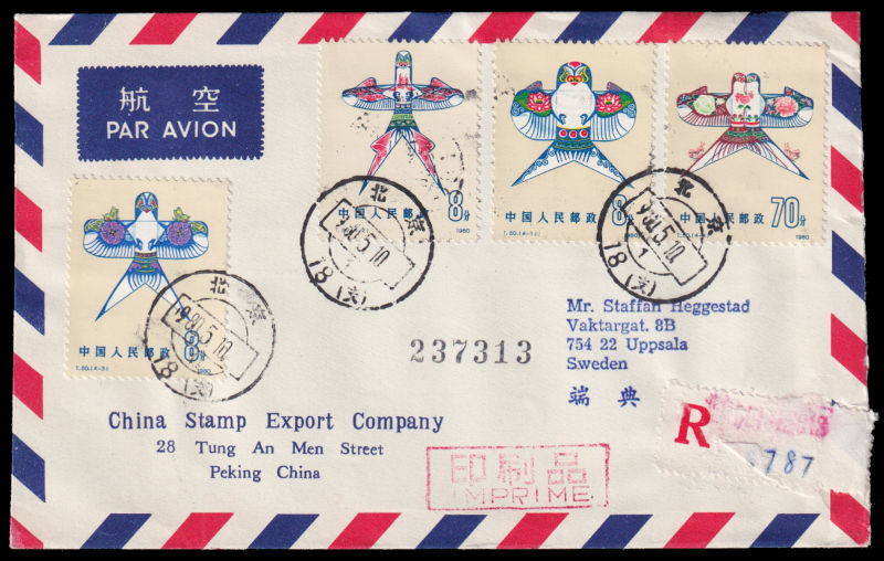 616 FDC Mi:1611-14, SG:2985-88 image1980 Kites set on official cover sent by registered airmail of China Stamp Export Company on first day of issuring to Sweden, additionally franked on reverse with R16/5f and R18/1f. 1980 T50风筝4枚全北京总公司公文封首日航空挂号寄瑞典, 封背加贴T44(16-2),普16/5分及普18/1分. (Image) (image11) (All Images)