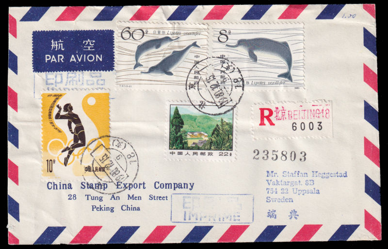 617 FDC Mi:1656-57, SG:3030-31 image1980 The Chinese River Dolphin set on official cover sent by registered airmail of China Stamp Export Company on first day of issuring to Sweden, additionally franked with J62(5-4) and R14/22f. 1980 白暨豚2枚全北京总公司公文封首日航空挂号寄瑞典, 加贴J62(5-4)及普14/22分. (Image) (image11) (All Images)