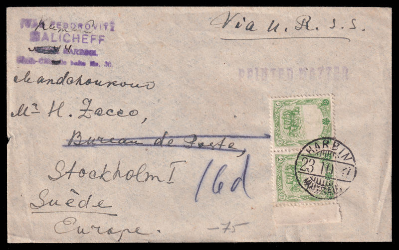 619 c   image1937 ? Cover for printed matter sent from Harbin to Sweden, franked with 2c pair 4th regular stamps. 1937 年? 哈尔滨寄瑞典印刷品封,贴第四版普票2分双连. (Image) (image11) (All Images)