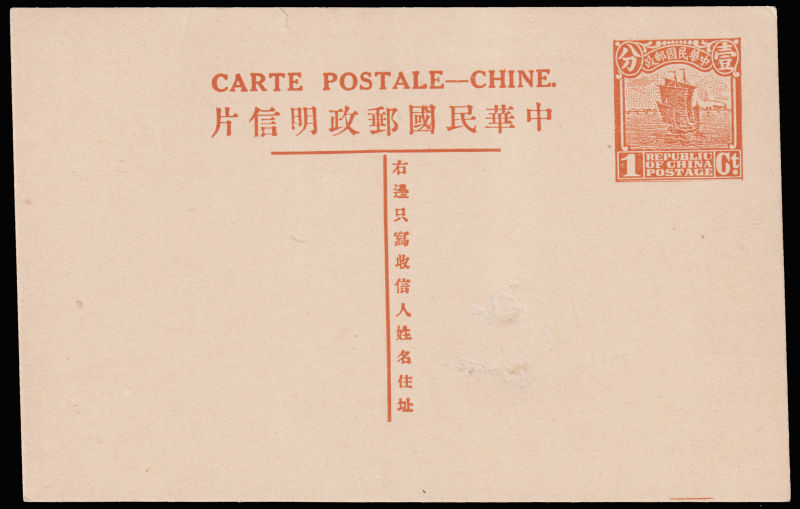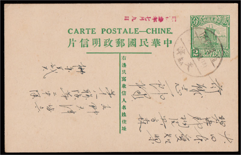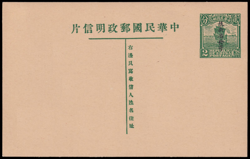 1931第八版帆船贰分邮资片加盖"限新省發寄"新, "姓"字左边局部漏印变体. (Image) (image11)