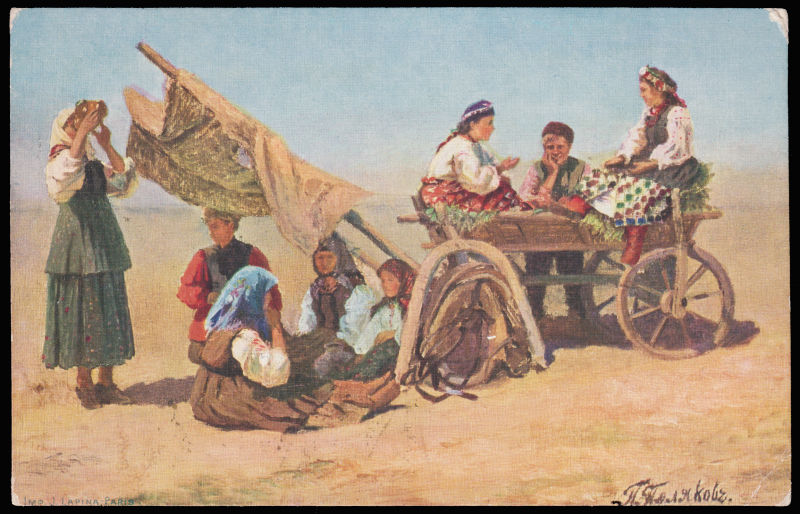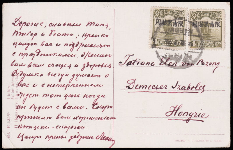 1930年? 油画明信片哈尔滨寄匈牙利, 贴加盖"限吉黑贴用"4分帆船票2枚, 销不清晰哈尔滨日戳. (Image) (image11)