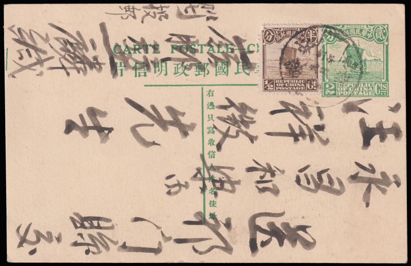 1935 7th print 2c green Junk card sent from Nanyingkiao to Shaoxing, additionally franked with 1/2c Junk stamp, with arrival cds alongside.