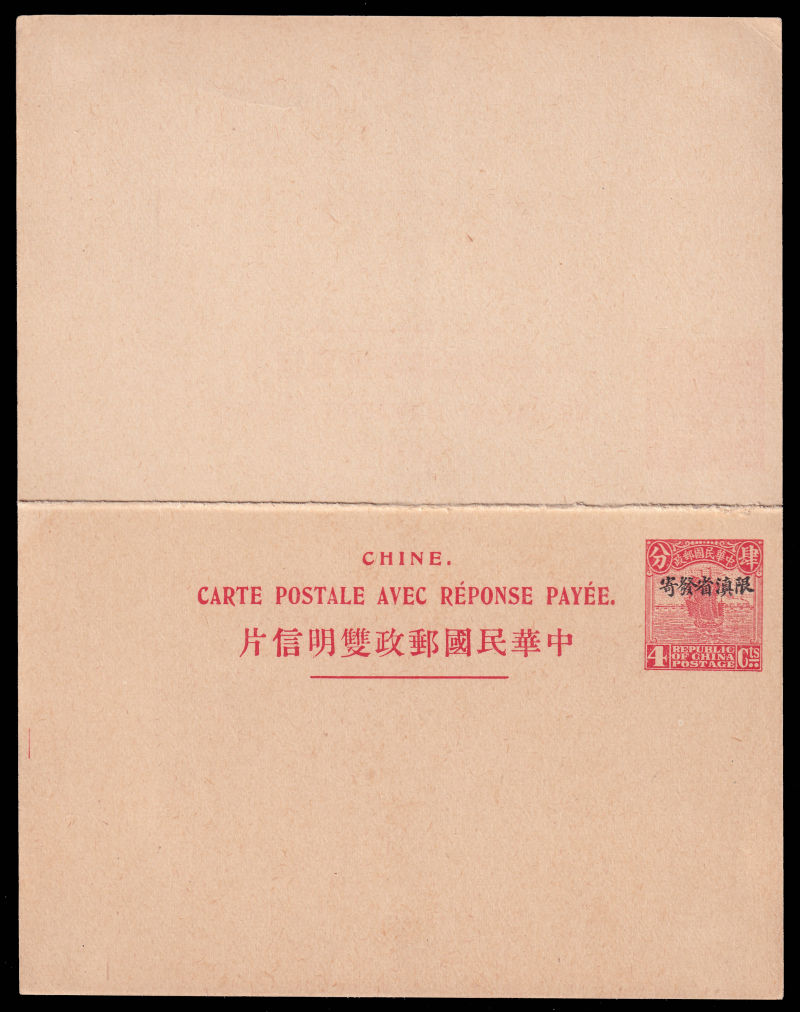 1926 Yunnan Prov 4th print Junk pre-stamped 4c+4c red double cards optd with "Restricted For Mailing in Yunnan Province" unused,with 4 hinge remnants on reverse.