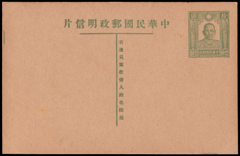 1946 孙像火炬邮资片拾圆新,左边及右下边各有一绿色线条. (Image)