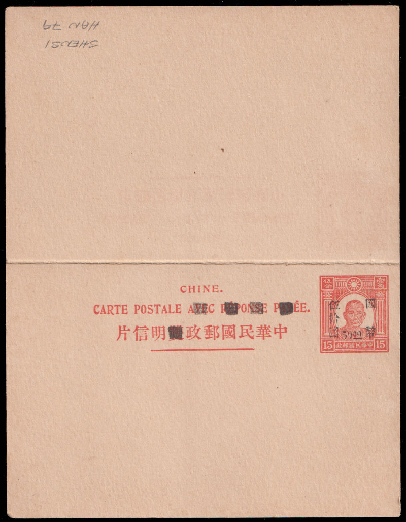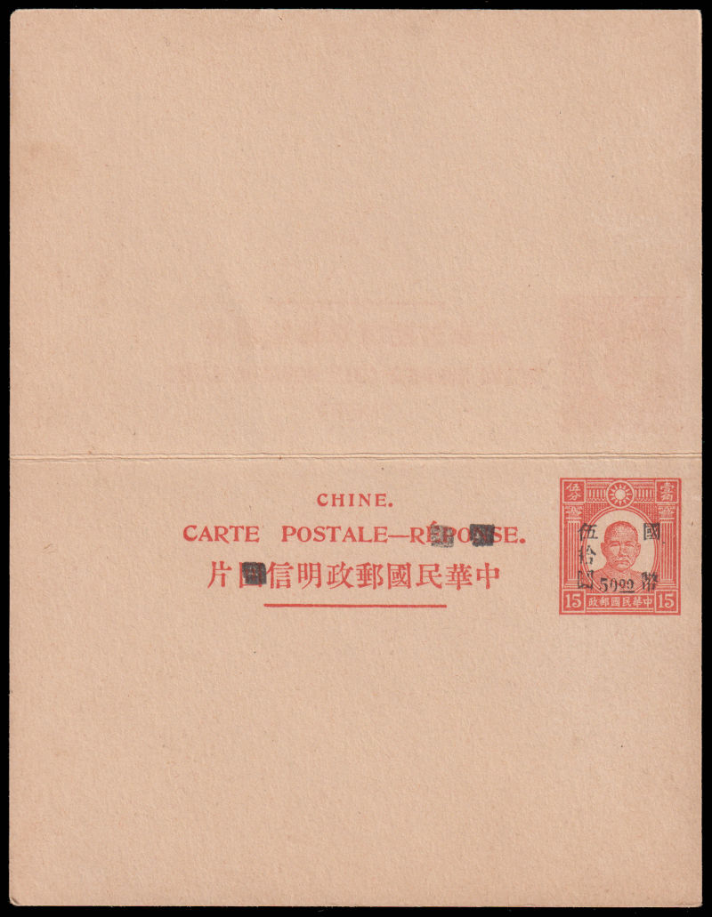 1947 Shanxi surch. CNC $50+$50 on 1st print SYS 15c+15c red double cards unused. 920ex issued only. Scarce.