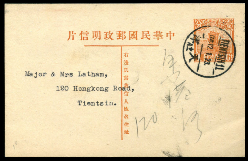 1934 7th print 1c pre-stamped Junk card used Tientsin locally.