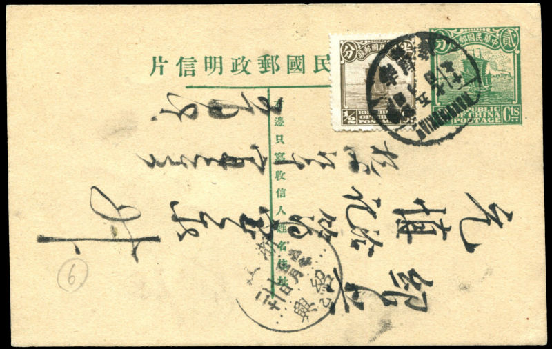 1932 Sep. 7th issue 2c green pre-stamped Junk card sent from Anhui Guanyingxia ? to Qimenxian,additionally franked with ½c Junk for the tariff of 2½c applied from 1932.05.20. Left side with green cutting