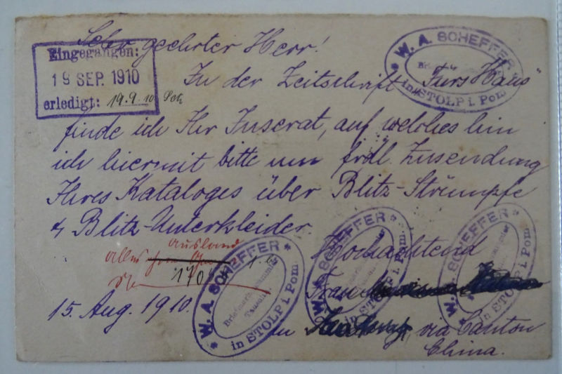 1910 8月18日清4次邮资片双片之回片广东新塘寄德国, 旁盖广州19日中转戳, 经法国驻广东客邮局运转欧洲, 背盖德国9月19日到达戳. 此片原始应该是完整双片寄德国于同一收件人, 故不需再贴附加邮资. (Image) (image11)