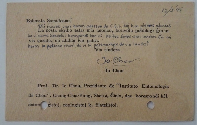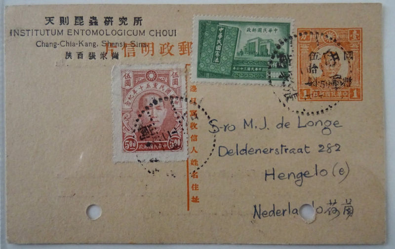 1948 1月12日陕西加盖国幤伍拾圆于壹分孙像邮资片,陕西张家岗寄荷兰,加贴伍圆及伍仟圆纪念票.由于彼时不断通货膨胀邮资不停调整,加盖国幤伍拾圆邮资片早已不适用,使用还要另行加贴大量邮资,相当不便,所以存世实寄片相当少见, 寄国外的更为珍罕,陕西加盖实寄国外的此前未见记录. 此片有两个订书机小洞. (Image) (image11)