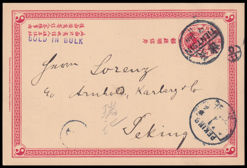 1911 Jan. 13 2nd issue 1c stationery card overprinted with "SOLD IN BULK", sent from Tientsin to Peking with arrival cds alongside, on reverse with business advertising.