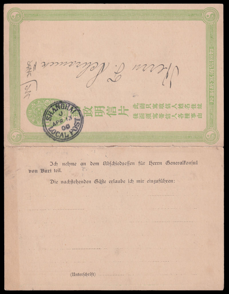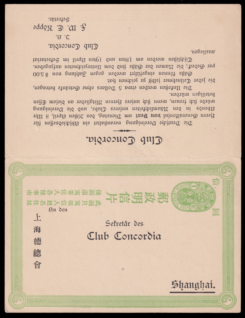 1909 Apr. 13 CIP 3rd issue 1c+1c Double cards with distance between top inner and bottom inner frame 119mm, pre-printed with Club Concordia information. Front part cancelled with Shanghai Local Post cds.