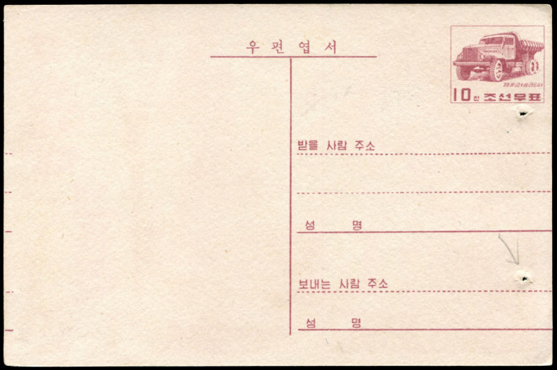 Pre-stamped 10ch Truck postcard with Diesel Train and Industry design on front, unused with two small holes. (Image) (image11)