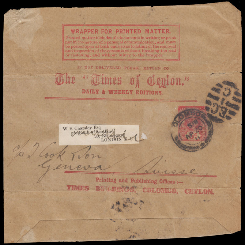 823 WRAPPER   image1911 CEYLON 6c King Edward VII newspaper wrapper sent from Colombo to Geneva, with arrival postmarking alongside. (Image)