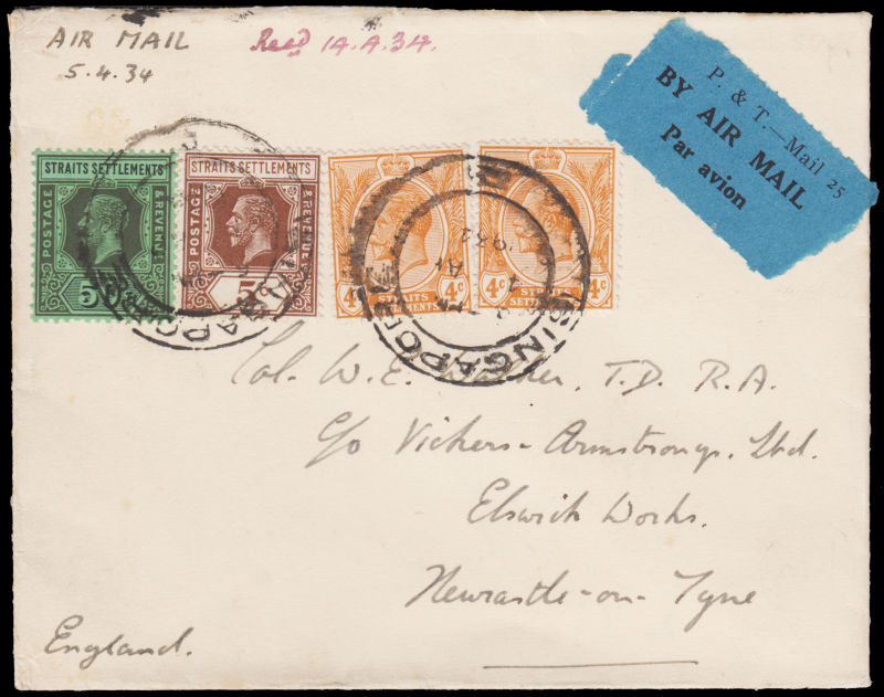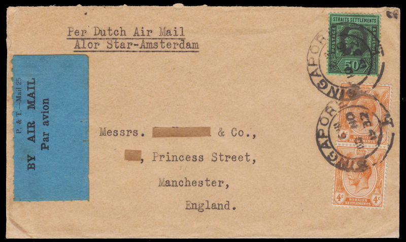 840 c   imageStraits Settlements 1932 Two airmail covers sent to England, franked with Straits Settlements stamps tied by Singapore cds. (Image) (image11) (image21) (All Images)