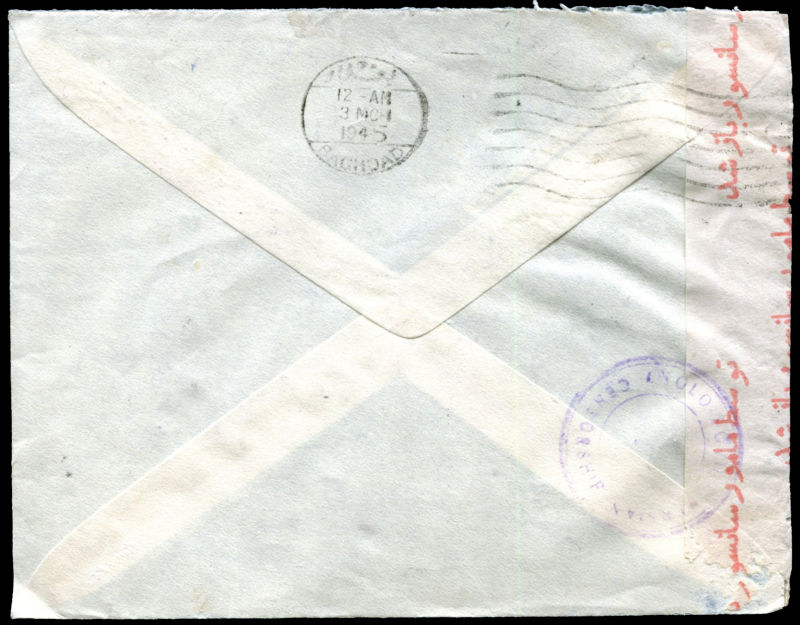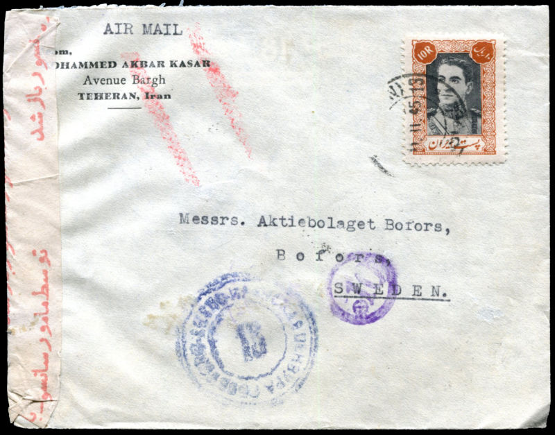 829 c   imageIRAN 1945 Airmail cover from Teheran to Sweden, franked with 10r stamp, with Baghdad roller transit dater and very rare "Anglo-Soviet-Persian" censor chop on revers. Probably one stamp has fallen off. (Image) (image11) (All Images)