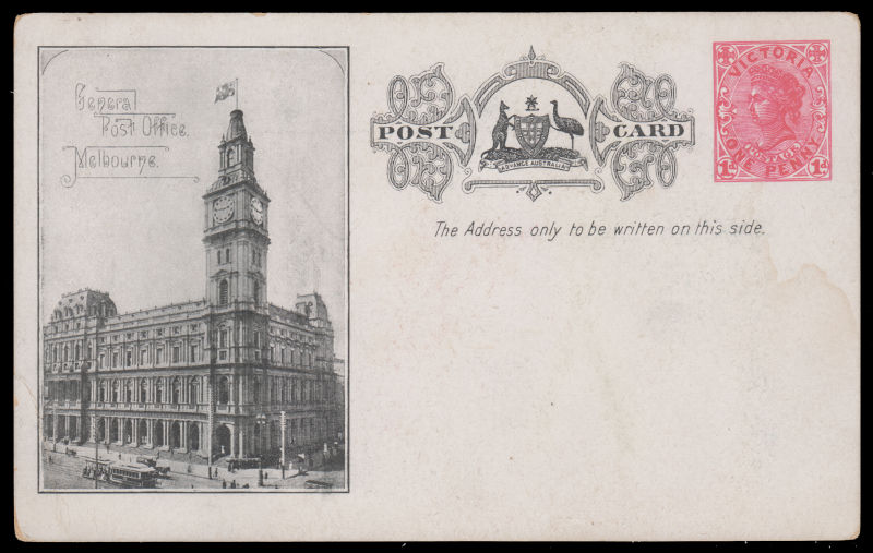 848 PSC   imageAUSTRALIA Victoria One Penny orange-red Postcard with view of Post Office Melbourne design on front and Australia greets America 1908 on reverse. Unused. Rare ! (Image) (image11) (All Images)
