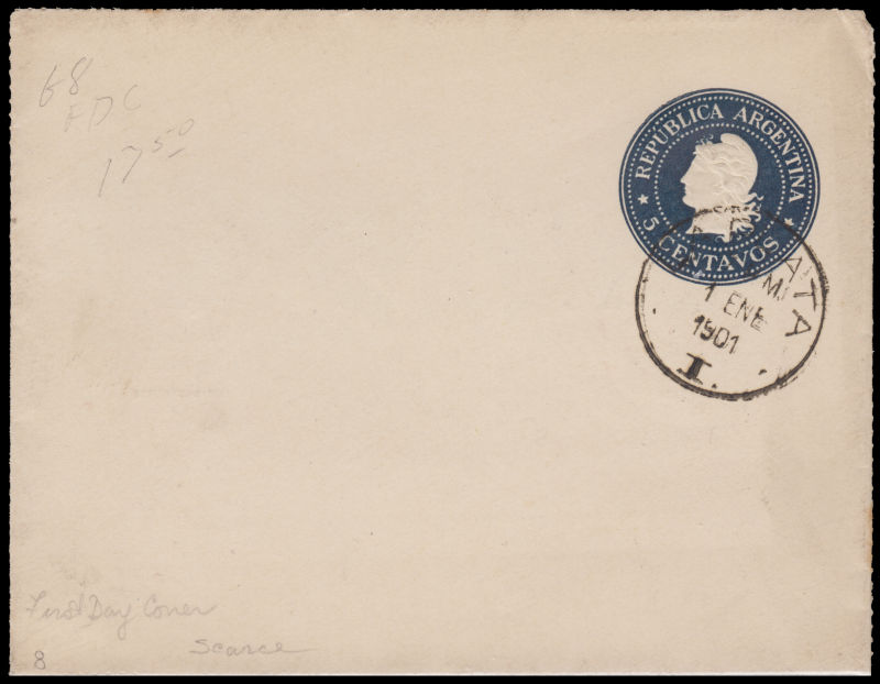 847 PSC   imageARGENTINA 1901 pre-stamped 5c envelope first day cancelled. (Image)