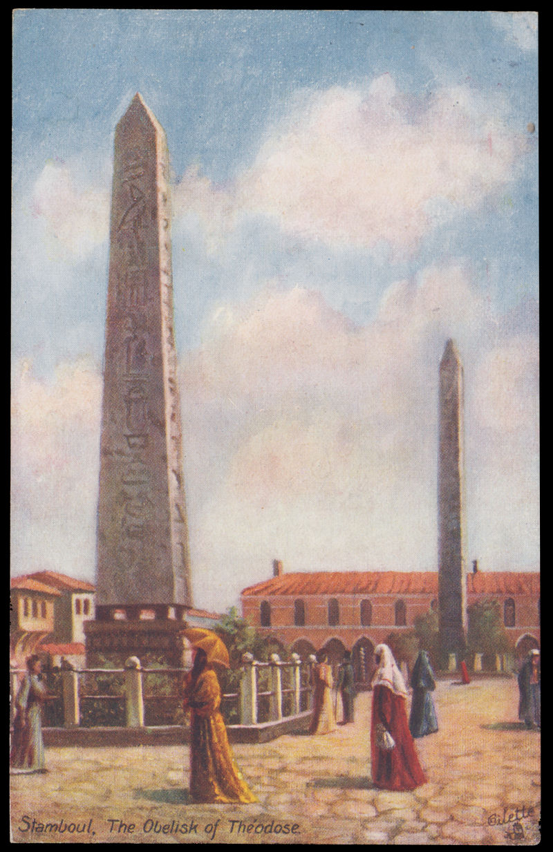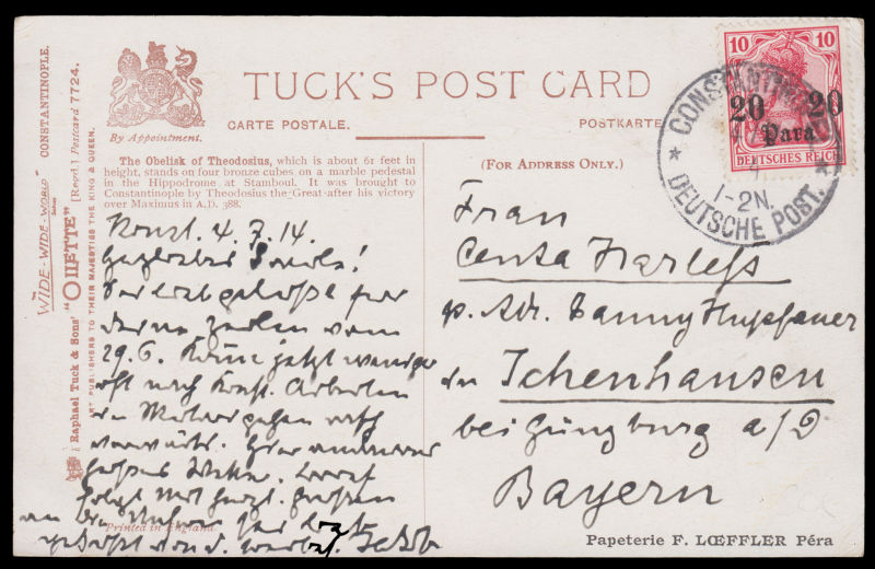 858 PPC   imageGERMANY 1914 PPC with Istanbul -The Obelisk of Theodos" design to Germany, franked with German Post Offices in Turkey 10pf overprinted with 20 PARA stamp tied by Constantinople 4/7.14 cds. (Image) (image11) (All Images)