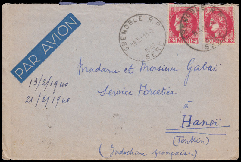 859 c   imageFRANCE 1940 Airmail cover sent from Grenoble to Hanoi, franked with French 2f x 2 stamps tied by 13.2/1940 cds, on reverse with Marseille transit roller dater and Hanoi 21-2/40 arrival cds. (Image) (image11) (All Images)