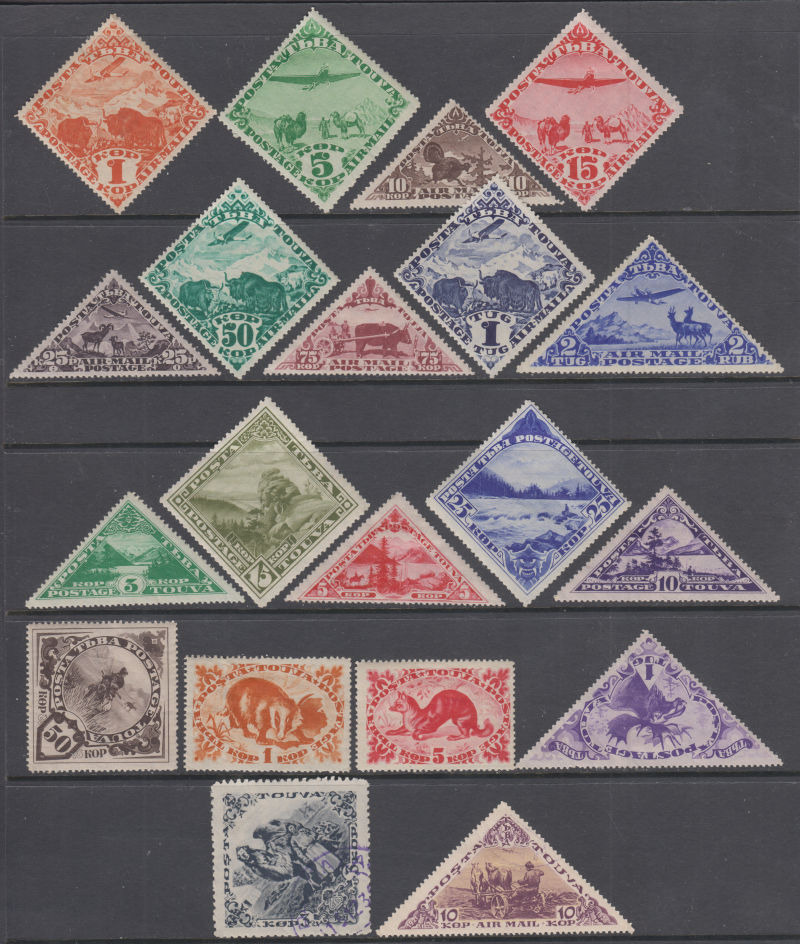 842   imageTOUVA 1934 Mi:49-57 Airmail stamps set, 1k thin on reverse, 2T in large size. Plus 11 other stamps (one used). (Image)
