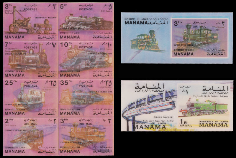 843 ★★   imageUAE Manama Ajman three-dimensional Stamps Locomotives set incl. MS. (Image)