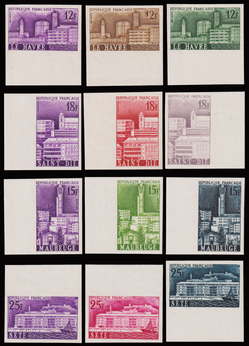855 ★★   imageFRANCE 1958 Yv:1152-55 Reconstruction set of 4 proof print in three different colors, all with margin. (Image)