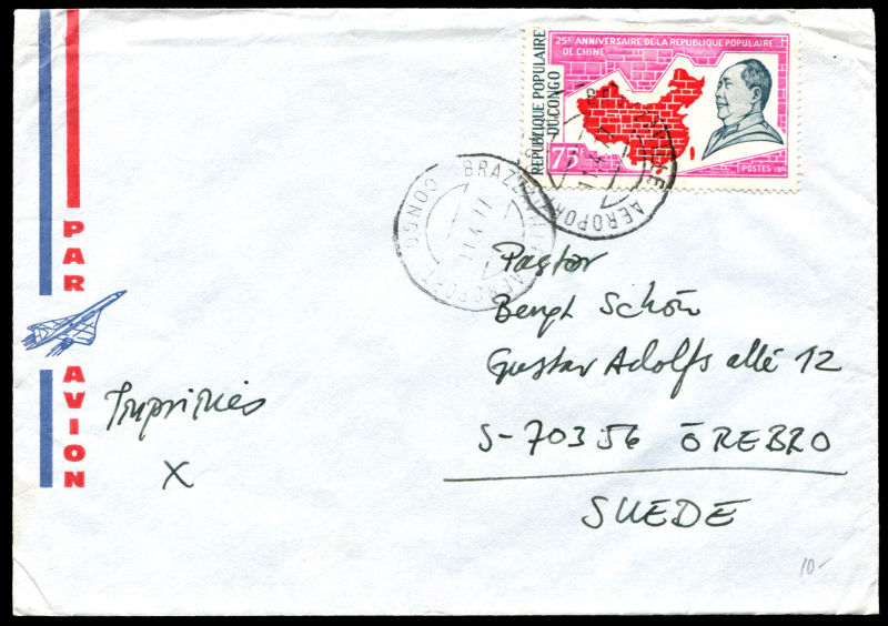 852 FDC   imageCONGO 1977 cover sent to Sweden franked with stamp with Mao design. (Image)