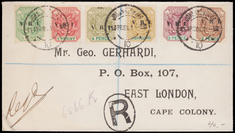 885 c   imageSOUTH AFRICA Registered cover sent 1911 from Johannesburg to London, franked with Transvaal stamps optd with V.R.I. with London arrival cds on reverse. Very beautiful franking. (Image) (image11) (All Images)
