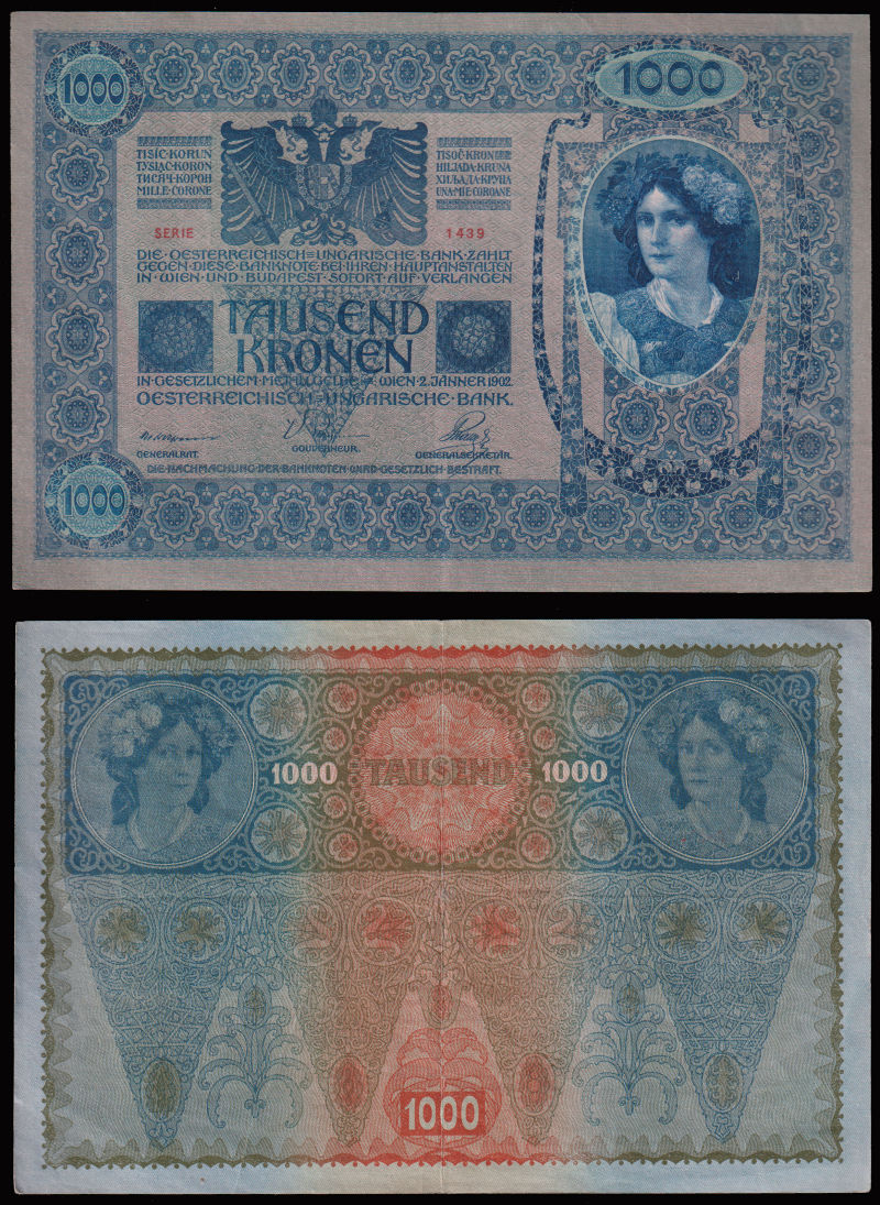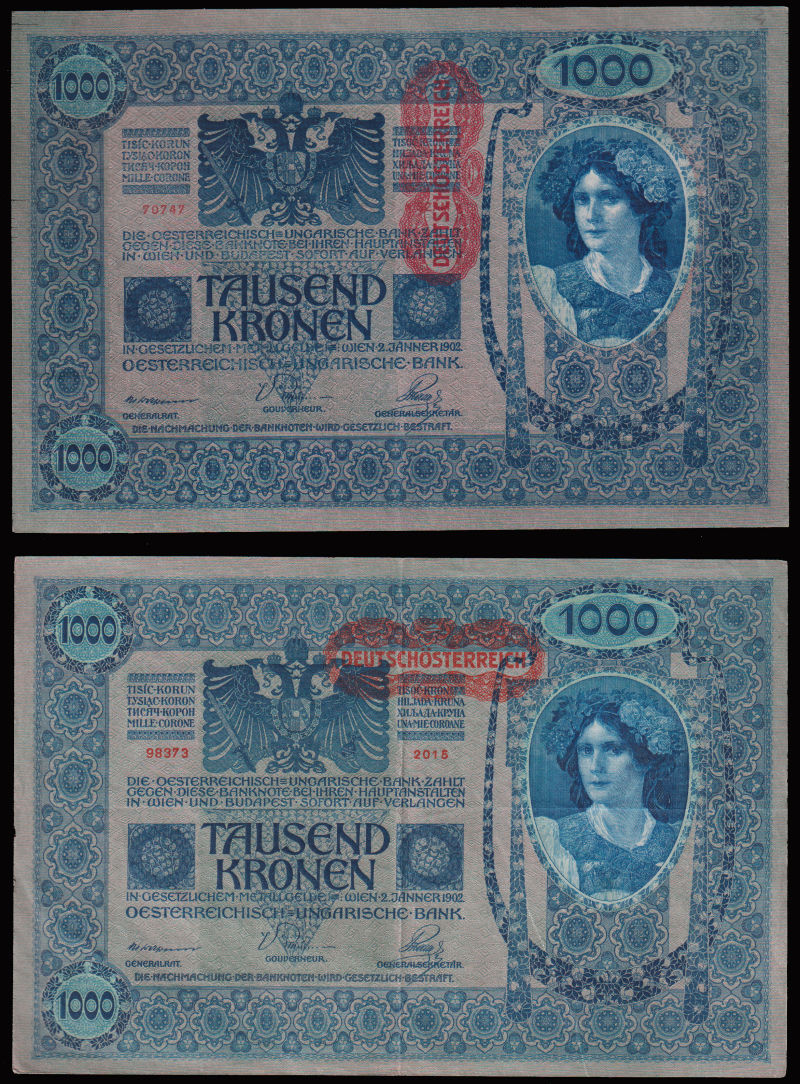 900   imageAUSTRIA 1902 Two different Oesterreichisch-Ungarische Bank 1000 Kronen ovpt red "DEUTSCHOSTERREICH". One near uncirculated and one cross folded. (Image) (image11) (All Images)