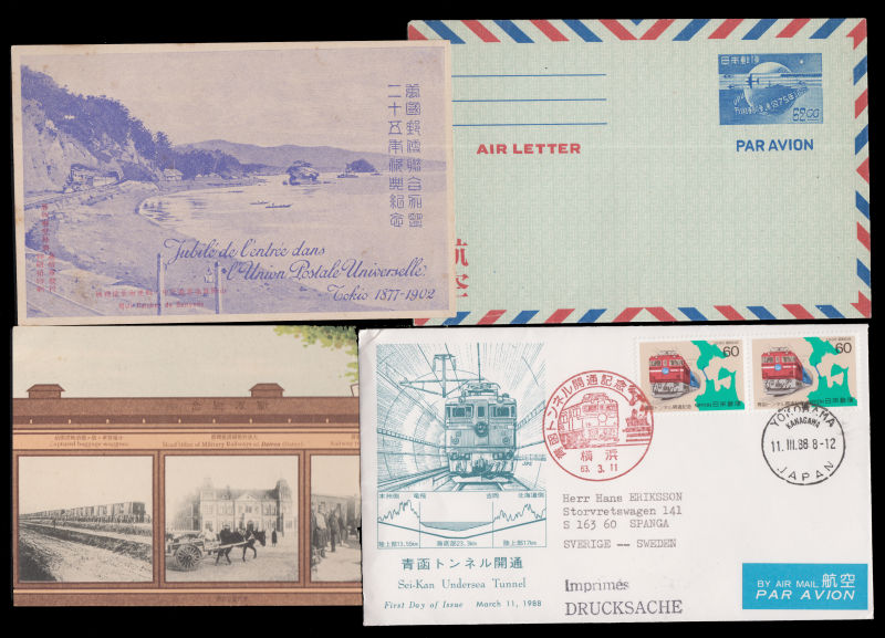 921 PSC   imageJAPAN group of 4 items with Railway motives, incl. a FDC sent to Sweden, plus two old pre-stamped cards inland used (both folded). (Image) (image11) (All Images)