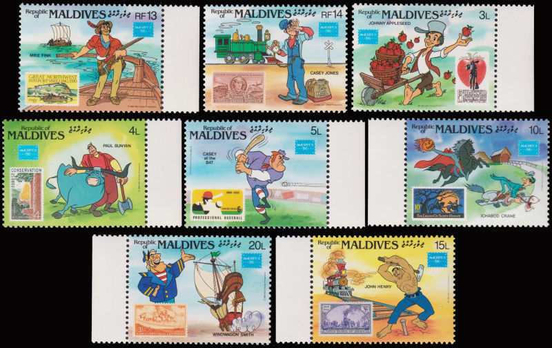 938 ★★   imageMALDIVE 1986 Mi:1175-82 Ameripex86 with Train and stamps motives. (Image)