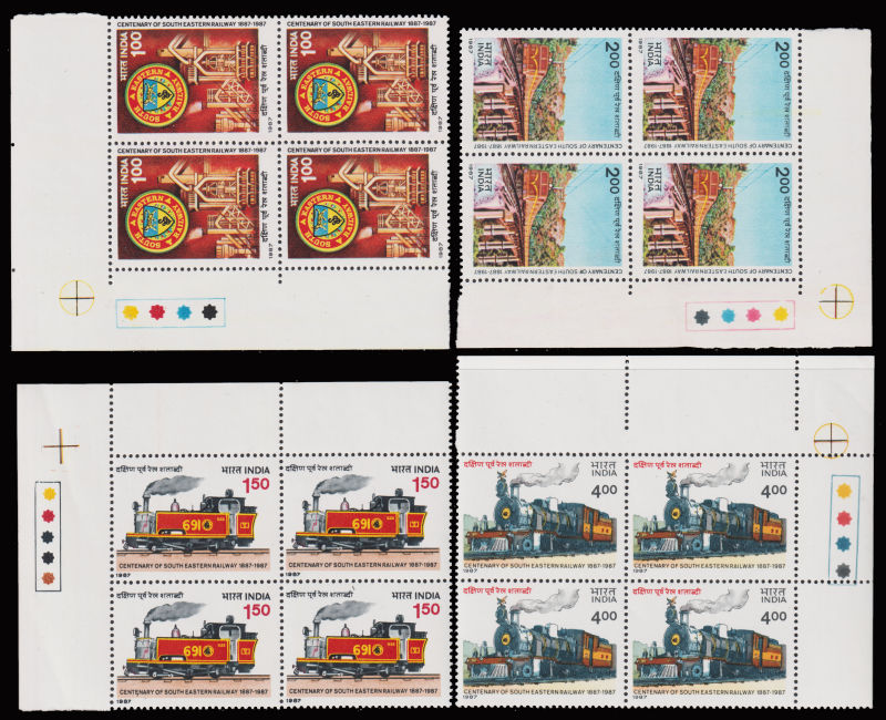 947 ★★   imageINDIA 1987 Mi:1087-90 Train set in corner blocks of 4. (Image)
