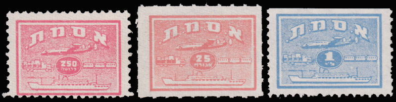 952   imageISREAL 3 revenue stamps with railway and transport motifs, no gum, one stamp folded. (Image)