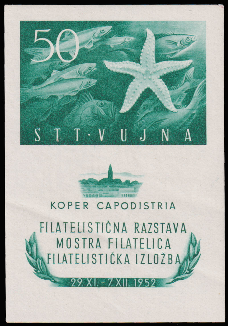 957   imageYUGOSLAVIA TRIESTE (Zone B) 1952 STT-VUJNA Philatelic Exhibition MS with sea motifs, with hinge trace and folded. (Image) (image11) (All Images)