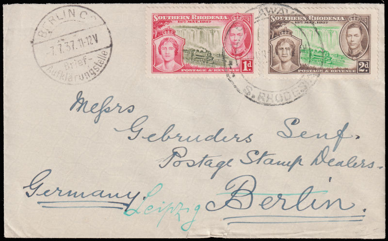 946 c   imageSOUTH RHODESIA 1937 cover sent to Berlin franked with with Train motifs. (Image)