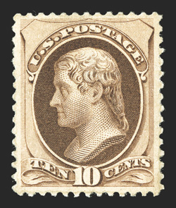 overall freshness, with gorgeous intense color and a prooflike impres#188, 10c Brown, with secret mark, a gem example of this scarce and difficult value, being in a condition that is far superior to the vast majority, as it features a remarkable overall freshness, with gorgeous intense color and a prooflike impression on crisp paper, exceptional centering within especially large margins, full o.g., lightly hinged, extremely fine; a wonderfully choice stamp; 1994 PF certificate and a 2008 PSE certificate (XF 90 OGph; SMQ $4,200.00); only two stamps grade higher. (Image) $2,000.00