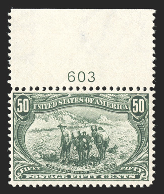 481 nh 291 291, 50c Trans-Mississippi, top margin plate no. 603 single, brilliantly rich color, o.g., n.h., nearly very fine 1995 PF certificate.#291, 50c Trans-Mississippi, top margin plate no. 603 single, brilliantly rich color, o.g., n.h., nearly very fine; 1995 PF certificate. (Image) $2,000.00