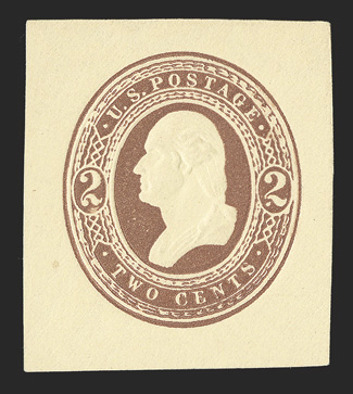 than its catalog value would indicate.#U407a, 2c Brown red on amber, die 2, large 49x52mm full corner mint cut square, good embossing that shows the die characteristics well, fresh and extremely fine; far scarcer than its catalog value would indicate. (Image) $375.00