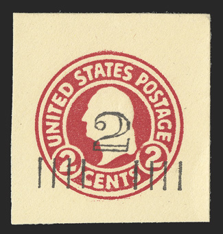 believed that only 33 entires were found, some having been reduced t#U455, 2c on 2c Carmine on amber, die 1, 36x38mm full corner mint cut square, vivid rich color on crisp clean paper, very fine; a rare and seldom offered cut square as it is believed that only 33 entires were found, some having been reduced to cut squares such as the example offered here. (Image) $2,250.00