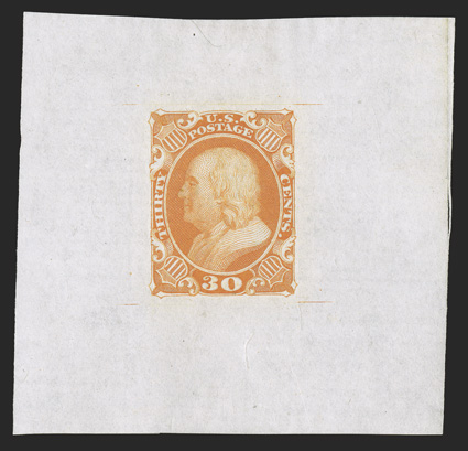 but unpriced in Scott 2007 PF certificate.#38P1, 30c Orange, large die proof on India, 57x55mm, strong bright color, very fine and rare; this is an especially appealing example as most are cut down to stamp size; listed but unpriced in Scott; 2007 PF certificate. (Image) Est. $1,000-1,500