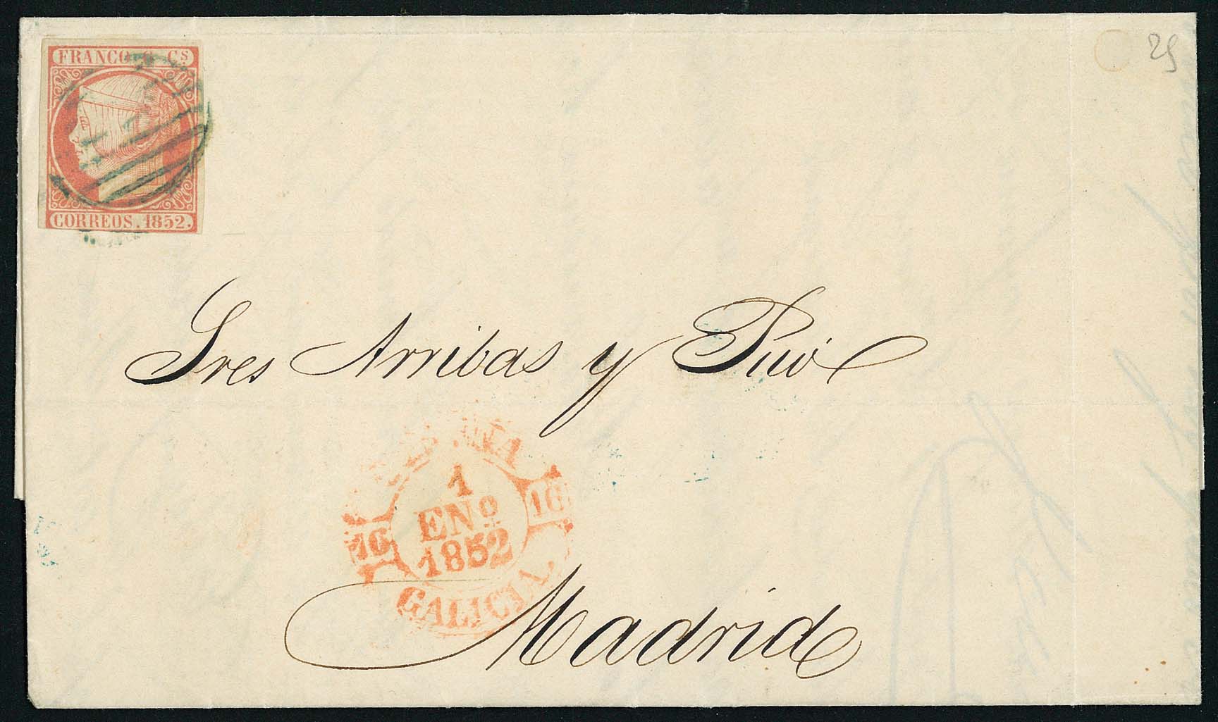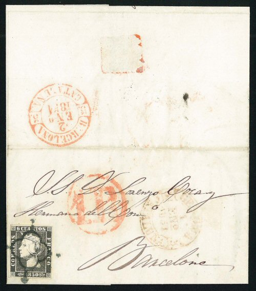10 c   imageTHE FIRST DAY COVERS COLLECTION OF CLASSIC SPAIN 1850-1874 The most comprehensive collection dedicated to the first classic issues of Spain being used on cover on its first day of issue or latest day of validation, formed over decades by one of the most, if not the most, important collector of Spanish philately in history. Cleanly and beautifully mounted on over 100 pages containing 167 covers and some stamps. An interesting section of stampless covers introduce the collection, demonstrating usages also without adhesives on the first day of Spanish philately, 1st January 1850, also including a cover dispatched one day before the first day of issue as well as other scarce usages. The franked postal history starts with the most important of the five first day covers of Spanish philately (1st January 1850) bearing an adhesive (all being franked by the 6 cuartos -the 12cu. and 10r. denominations are only known used from March-). This item possess a feature of great importance in Spanish philately as its contents state this cover to have been franked by the new postage stamp, with the sender expressing his hopes about this new means: "Esta carta ba (va) con el sello nuevo de franqueo, haber (a ver) si esto será lo que nosotros pensamos, aunque así lo creo". The 1st January 1850 date accompanied by the significant text make this a key item of classic Spanish philately. (cert. Graus). Throughout the classic issues from 1850 to 1874, 22 issues exhibit its first day of issue usage on cover. In many cases other scarce usages on the second day of issue, penultimate or mainly last days of issue, as well as mail travelled out of the period of validation with the adhesive being demonetized or even accepted (which is of great rarity), are also included. Other extraordinary examples are exceptional uses before the first day of issue; or even very rare contemporary usages with later issues when the previous issue had been demonetized, thus resulting in unique mixed frankings. The covers mainly exhibit single frankings, but other combinations are also represented, with some items being also addressed to foreign destinations. Throughout the collection a considerable duplication can be found. It is a daunting challenge of time and obvious difficulty to gather an assembly of this calibre, which features one of the most fascinating characteristics of postal history: the usages on the first day of issue in classic philately. This sale consequently confers a wonderful opportunity to get an utmost desirable collection which was formed with patience, discernment and taste, and would be virtually impossible to repeat. (Image) (imagea) (imageb) (imagec) (imaged)