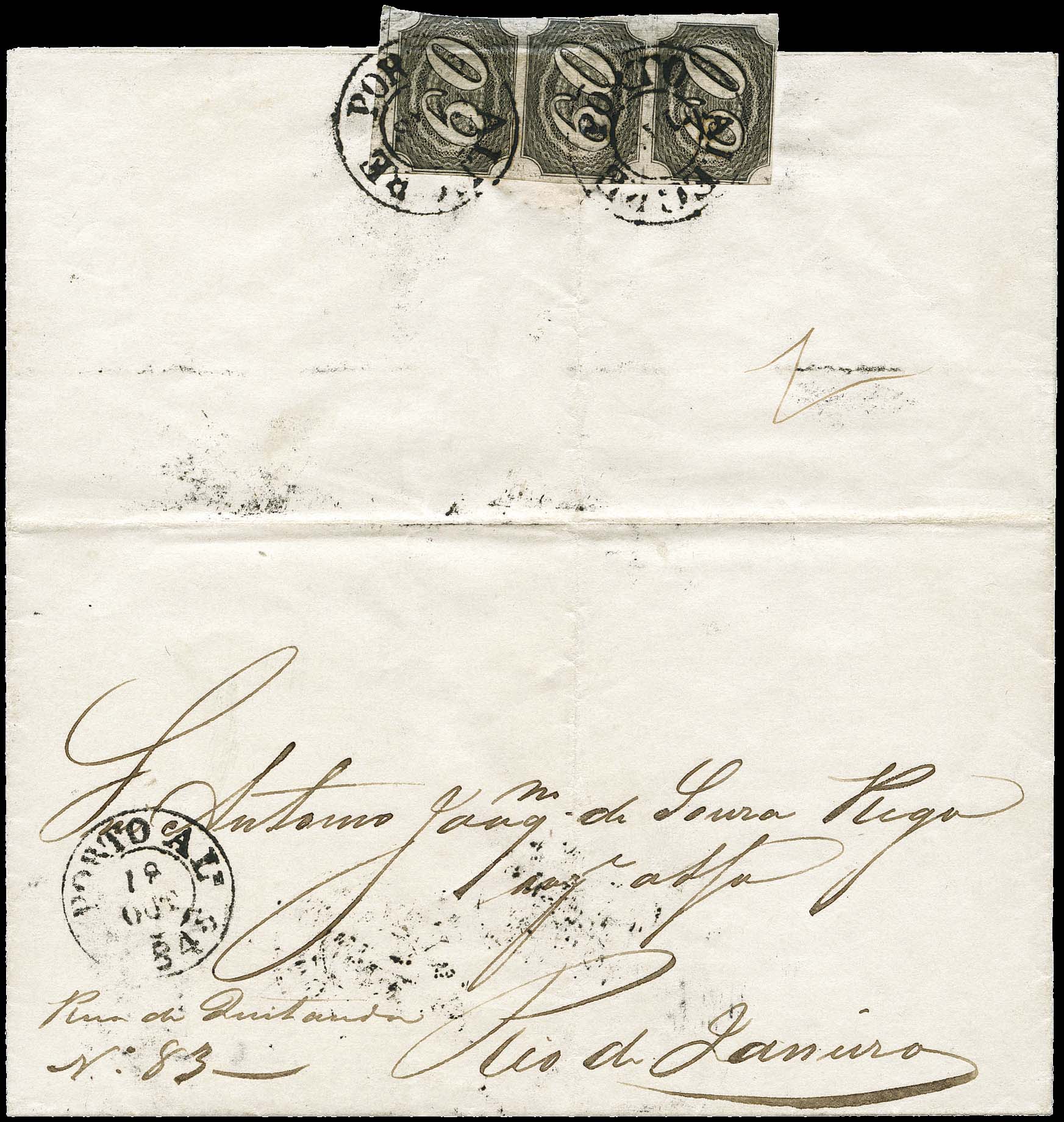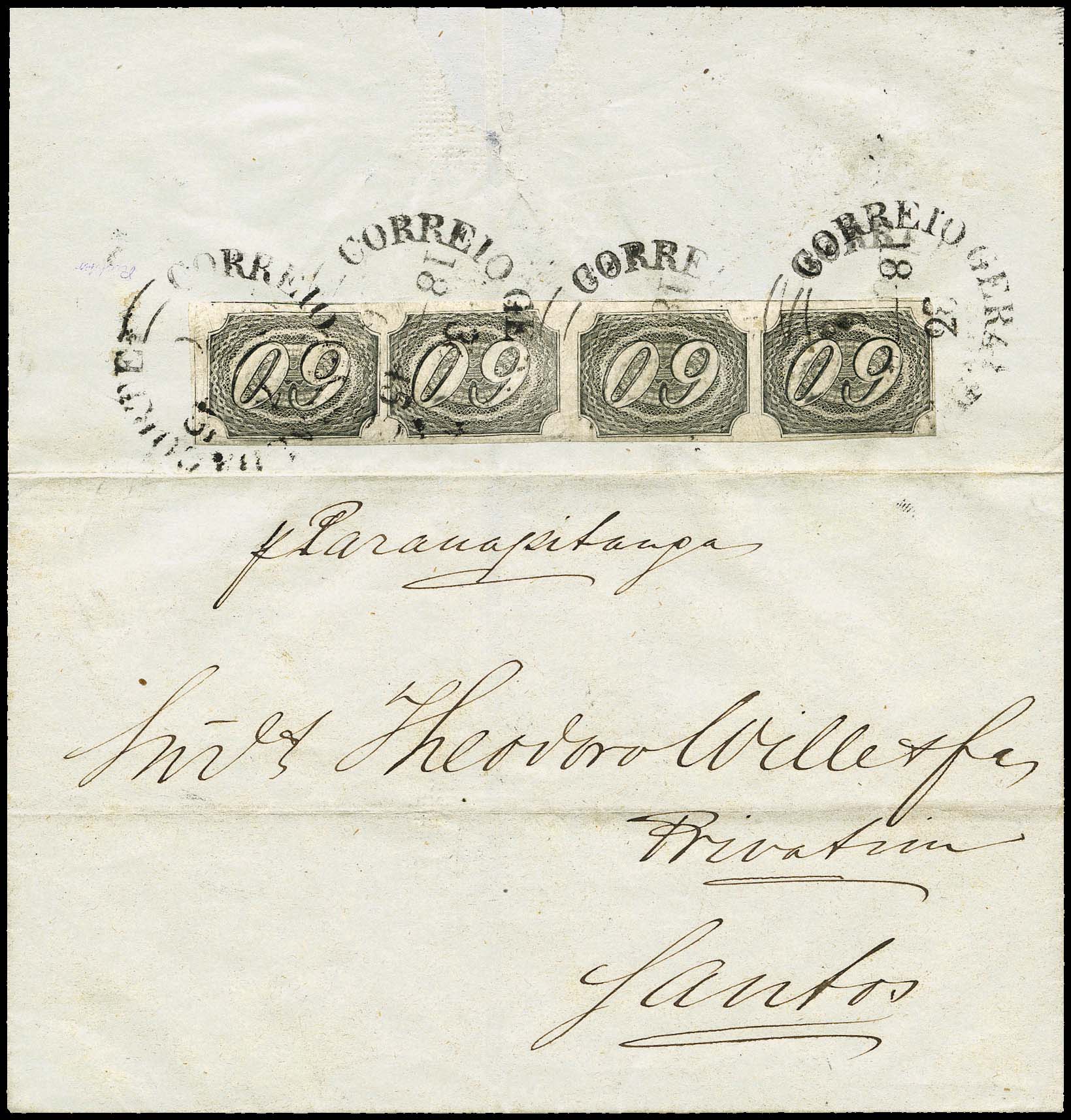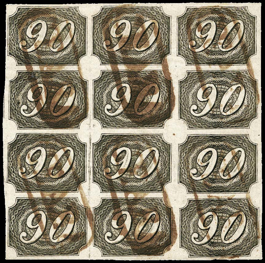 the stunning 90r. block of 12; the only cover recorded bearing a mixed franking composed of "Inclinados" stamps printed on "Bull's Eyes" and the thin papers; the 30r. type II, a used example of the rarest stamp of Brazilian philately (only five so