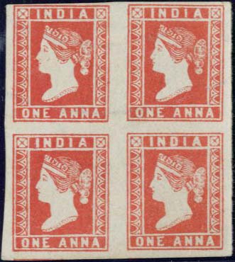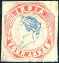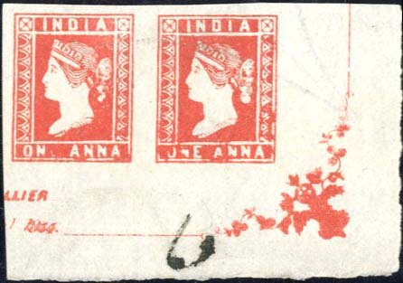 6 ogO   imageIndia A small select group of the 1854 issue, comprising ½a. red proof on East India Company watermarked paper; 1a. Die II deep red unused lower right corner pair, [95-96], showing major inking flaw with "E" of "ONE" completely omitted, Brandon Certificate (1999) incorrectly attributed as Die I; 1a. Die II deep red and dull red unused blocks of four; 2a. green huge used example showing additional outer framelines all round; 4a. 4th. printing, pale blue and pale red, unused, R.P.S. Certificate (1969), and 4a. 4th. Printing deep blue and red used horizontal pair, [9-10], with part "10" (decimes) French handstamp. A choice and most attractive group in very fine condition. (Image) (imagea) (imageb) (imagec)