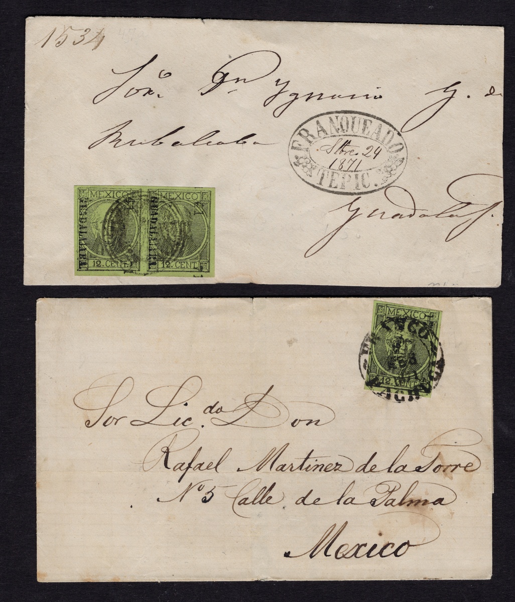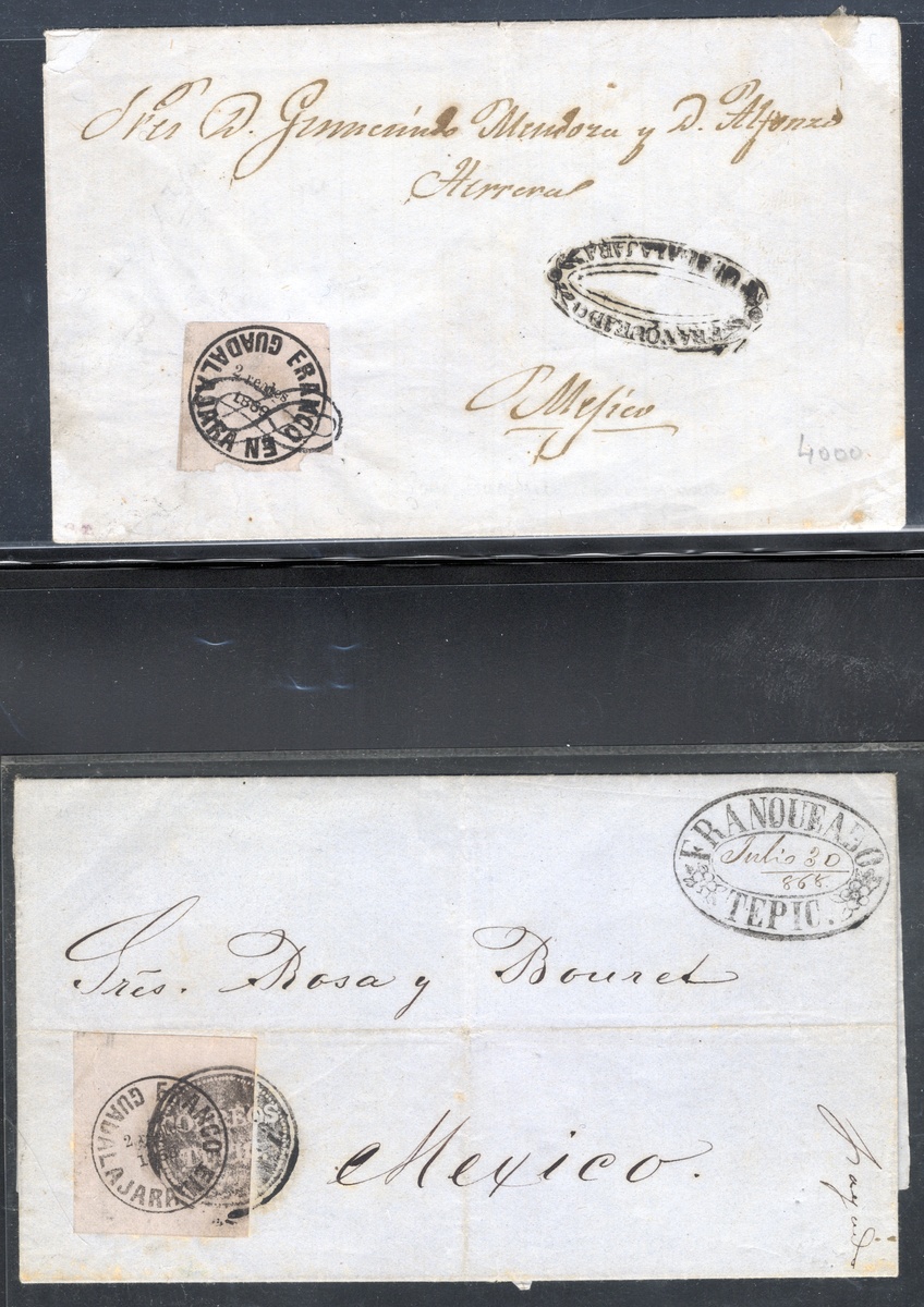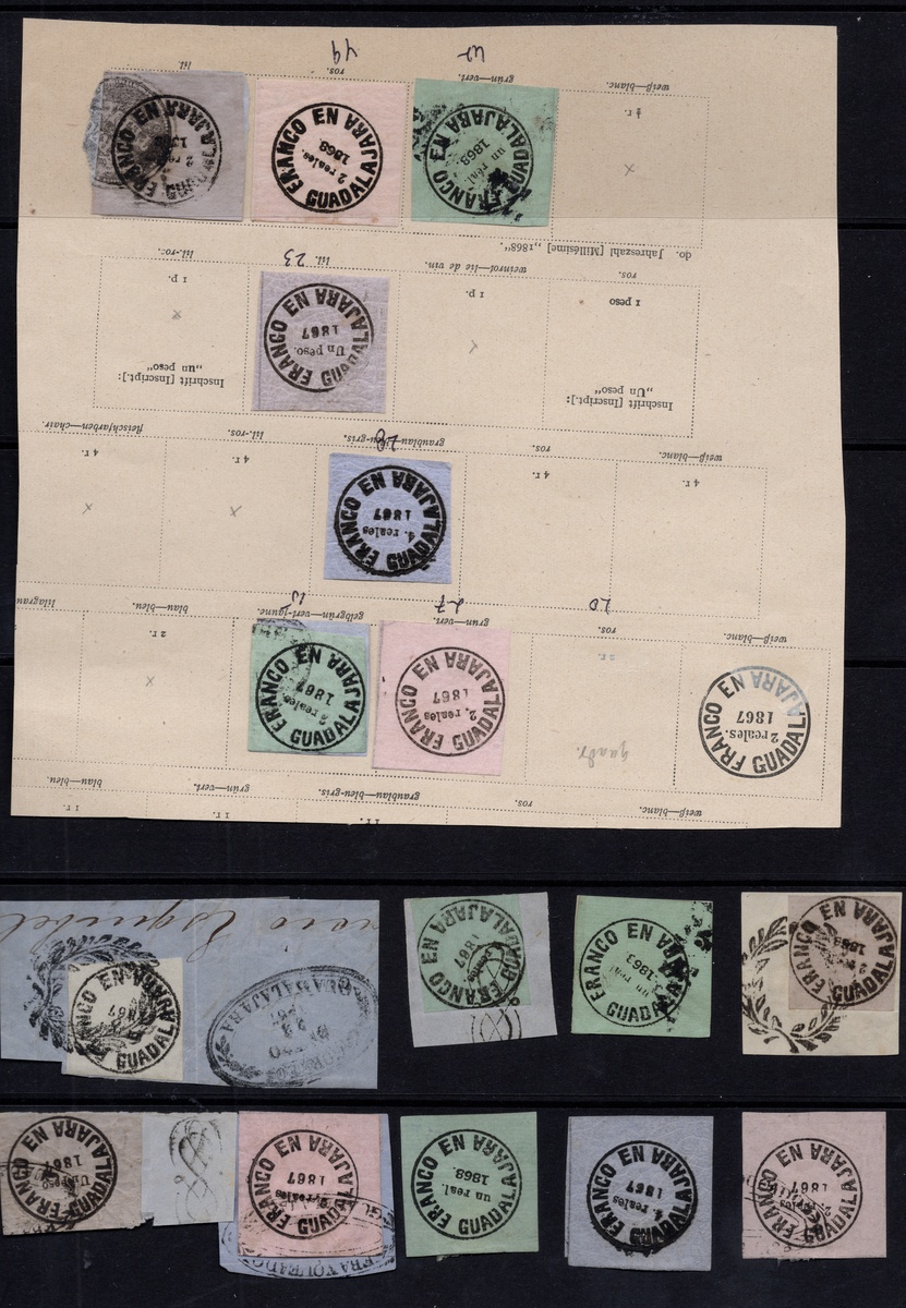 221 Used   imageMexico. 1867 "Guadalajara Provisionals". 1867 Group comprising 16 stamps and two covers, with most stamps in used condition and the highlight being one 1r. White wove 1st Period on piece, used with a fantastic wreath cancel dated January 23, 1867 ($250). Among other better examples, we find the uncommon 1r. Green 4th Period on Laid Paper, variety "1863" for "1868" (Scott $300), a very bright and fresh 2r. Rose 4th Period unused (almost looks like white). The 1868 cover from Tepic is very attractive, displaying a lovely cancel. Scott Guadalajara 4, 13,15, 20, 23, 25-28, 38, 42, 47c, 49, $800 for off cover singles., , (Image) (Image2) (All Images)