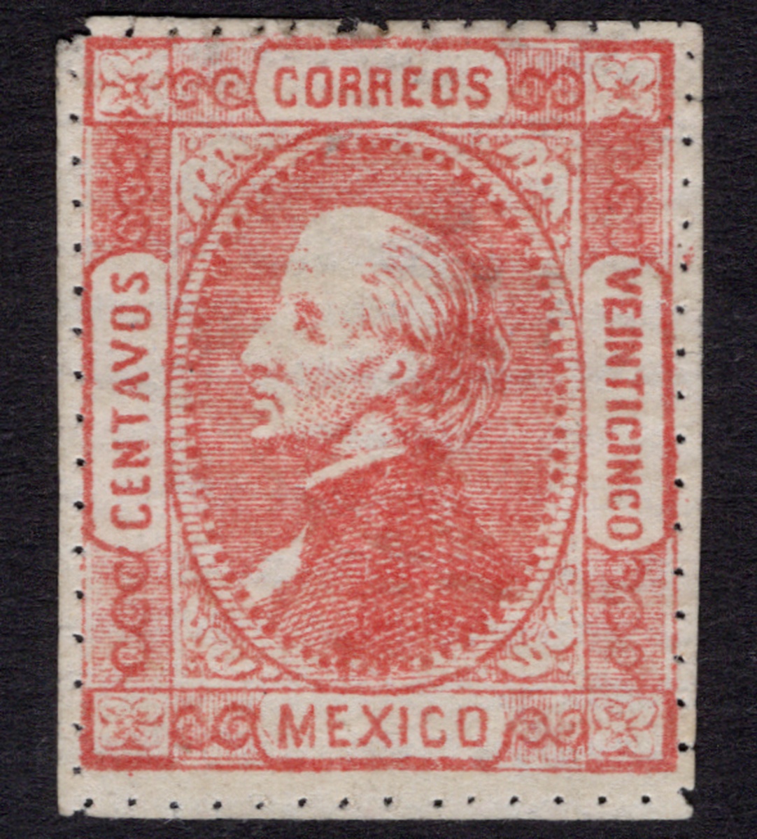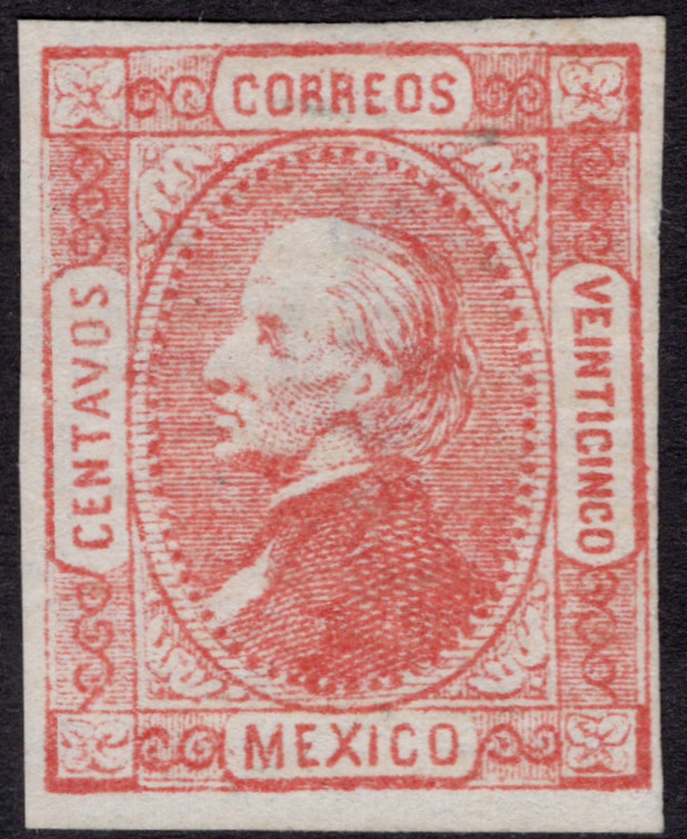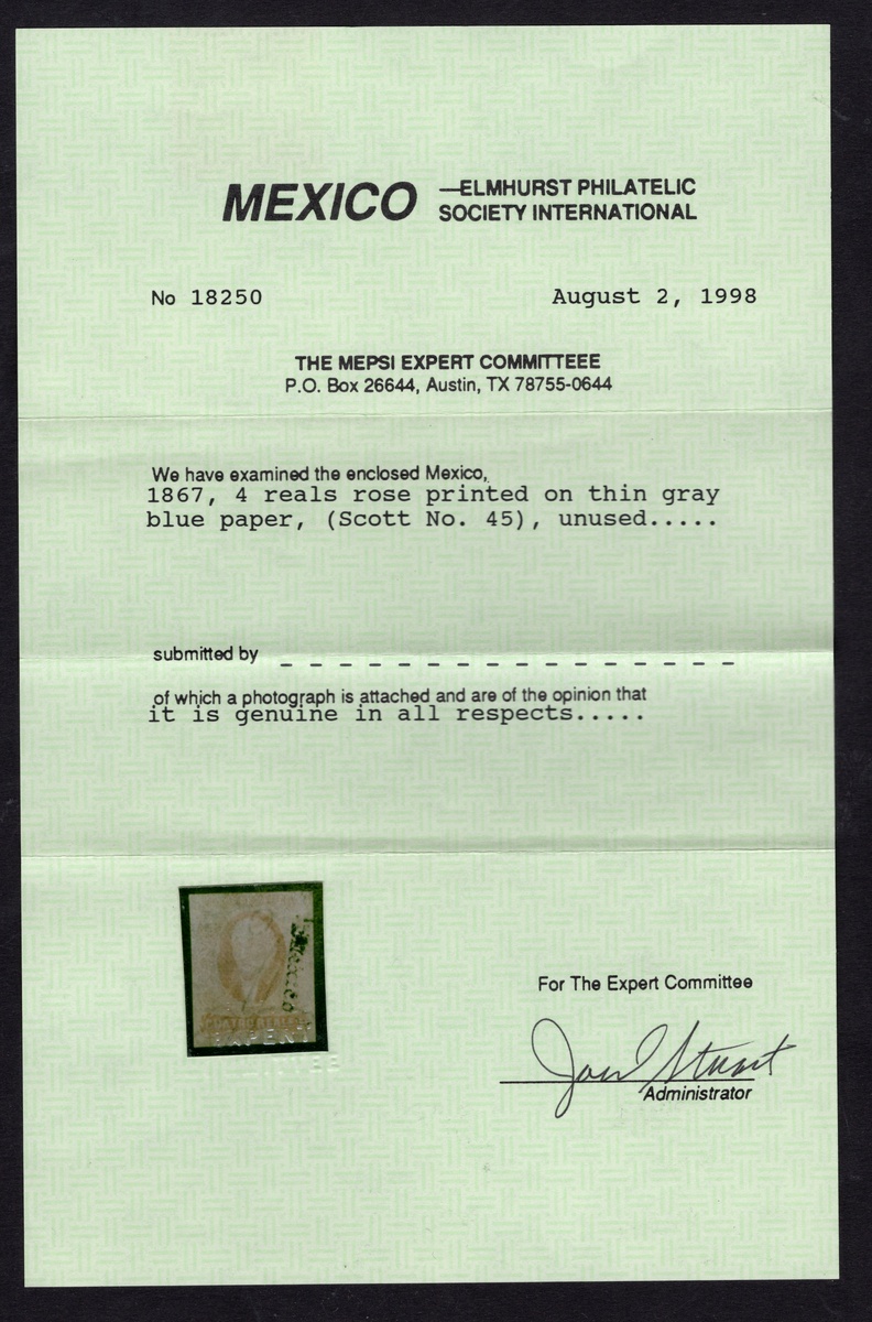 222   imageMexico. 1867 "Hidalgos" Gothic. Mexico Gothic 4r. Rose on thin watermarked paper, an unused example displaying a fresh impression, very large margins for the most part, close at top. An exceptionally rare and beautiful stamp, with only 13,470 issued and sold out. One of the finest examples of just four or five recorded in unused condition. 1998 MEPSI certificate. Scott 45, $3,000. (Image) (Image2) (All Images)