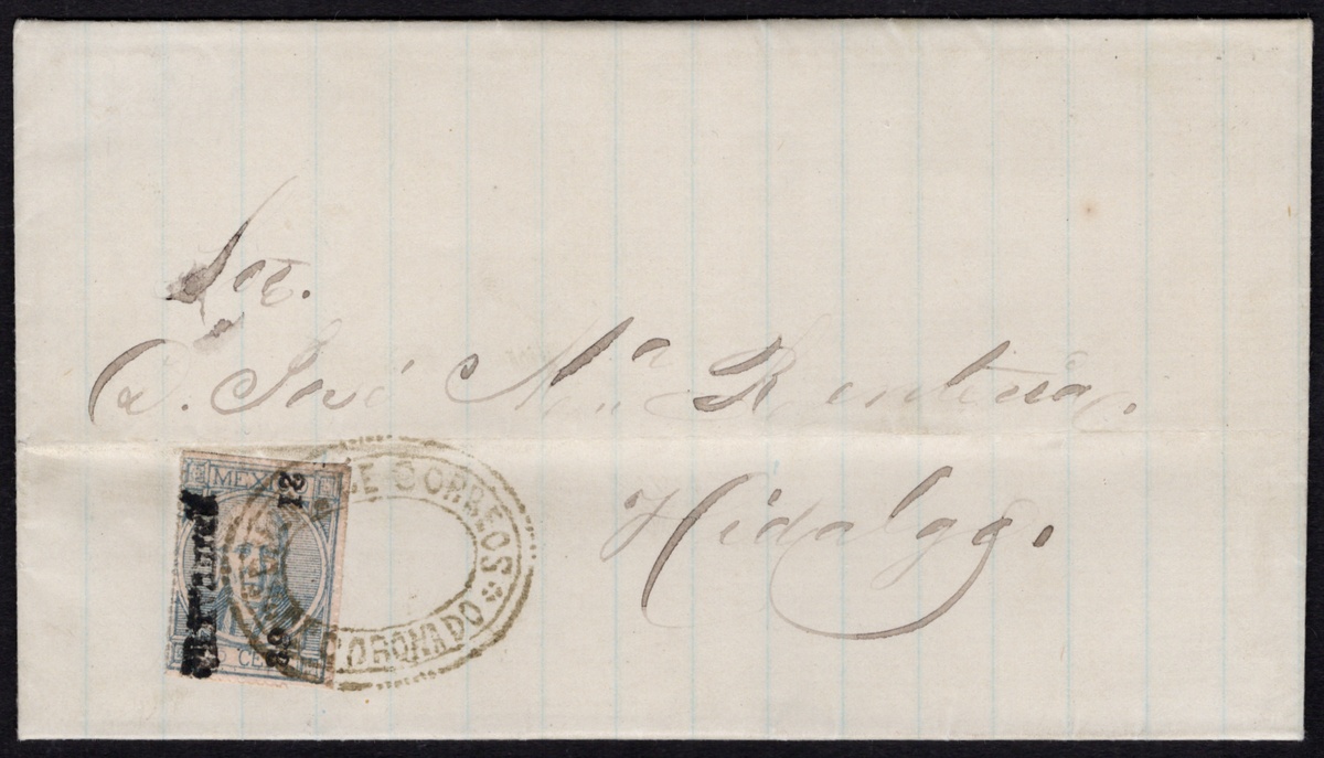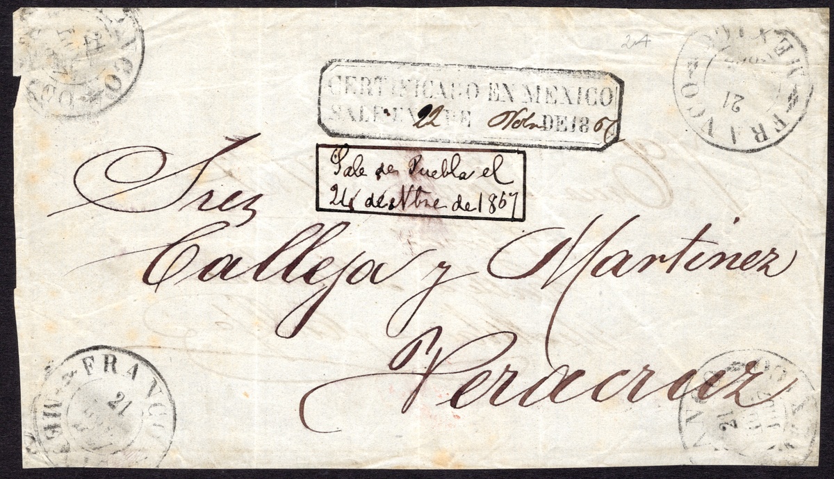 223   imageMexico. 1867 "Hidalgos" Gothic. Mexico District Stampless registered front from Mexico City to Veracruz, dated November 22, 1867, and struck in transit at Puebla on November 24. According to postal regulations, upon receipt of the package or letter, the front was to be cut out, and the addressee was to sign the back, and then the front was returned to the office of origin, where it was kept for two years as proof of delivery before being destroyed. This item should have been affixed with an eight reales stamp to cover the certification charge. However, it likely did not use stamps because it was sent just as the new Mexico Gothic stamps were being distributed to the Mexico District office, traveling instead with a sello negro. At most only five known. (Image)