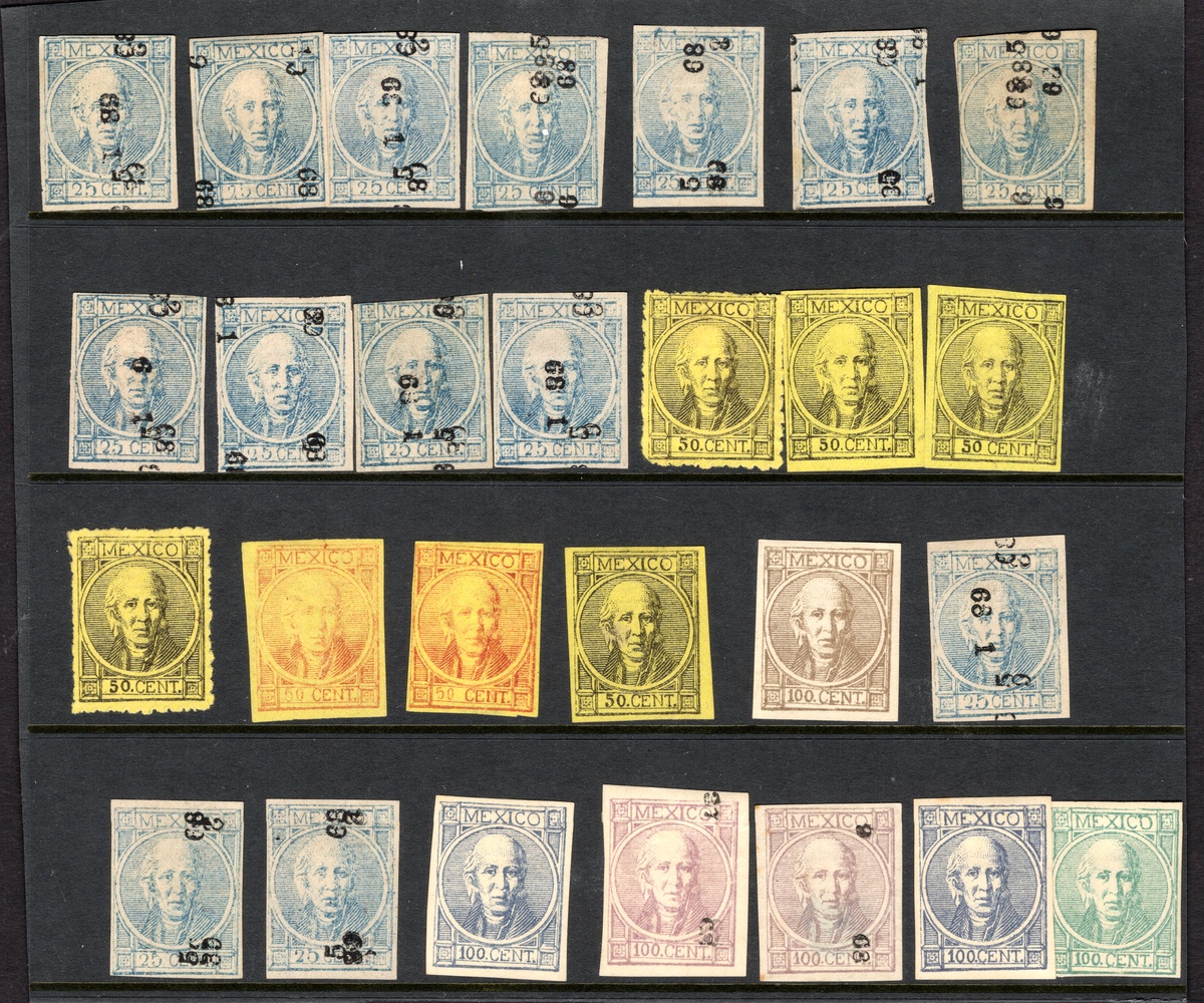 225 Proof   imageMexico. 1868 "Hidalgos". 1868 Group of 18 imperforate proofs and trial color proofs in singles and one pair, mostly featuring the 100c. Thick Figures in a wide range of colors; the others being singles of the 25c. Thin Figures and 50c. Black on Yellow Thick Figures -the 25c. and one 100c. have trial consignment numbers, and two 100c. show trial district names-. All have thins, but they are scarce and very appealing exhibition items. Scott 48v, 64v, 69v. (Image)