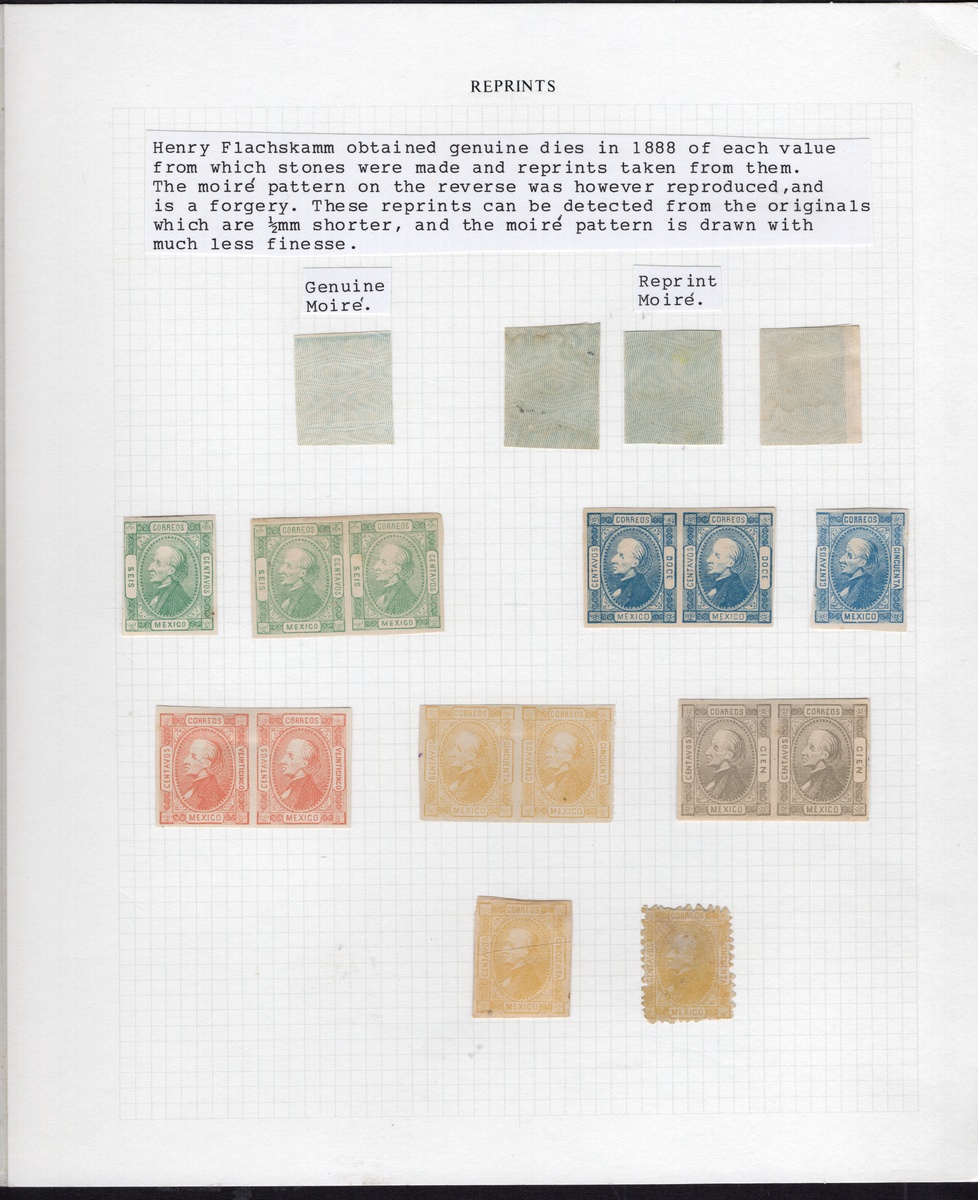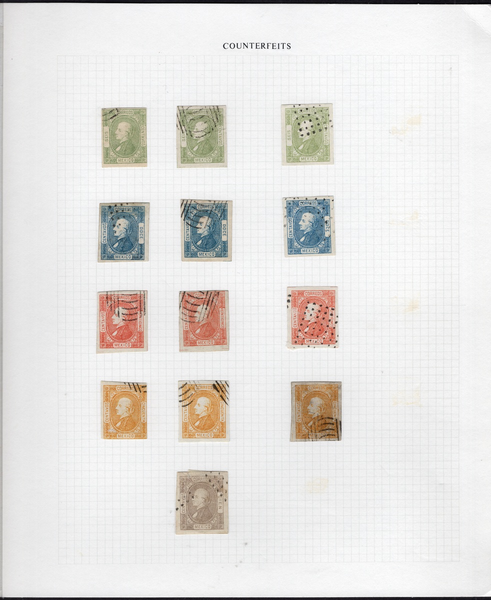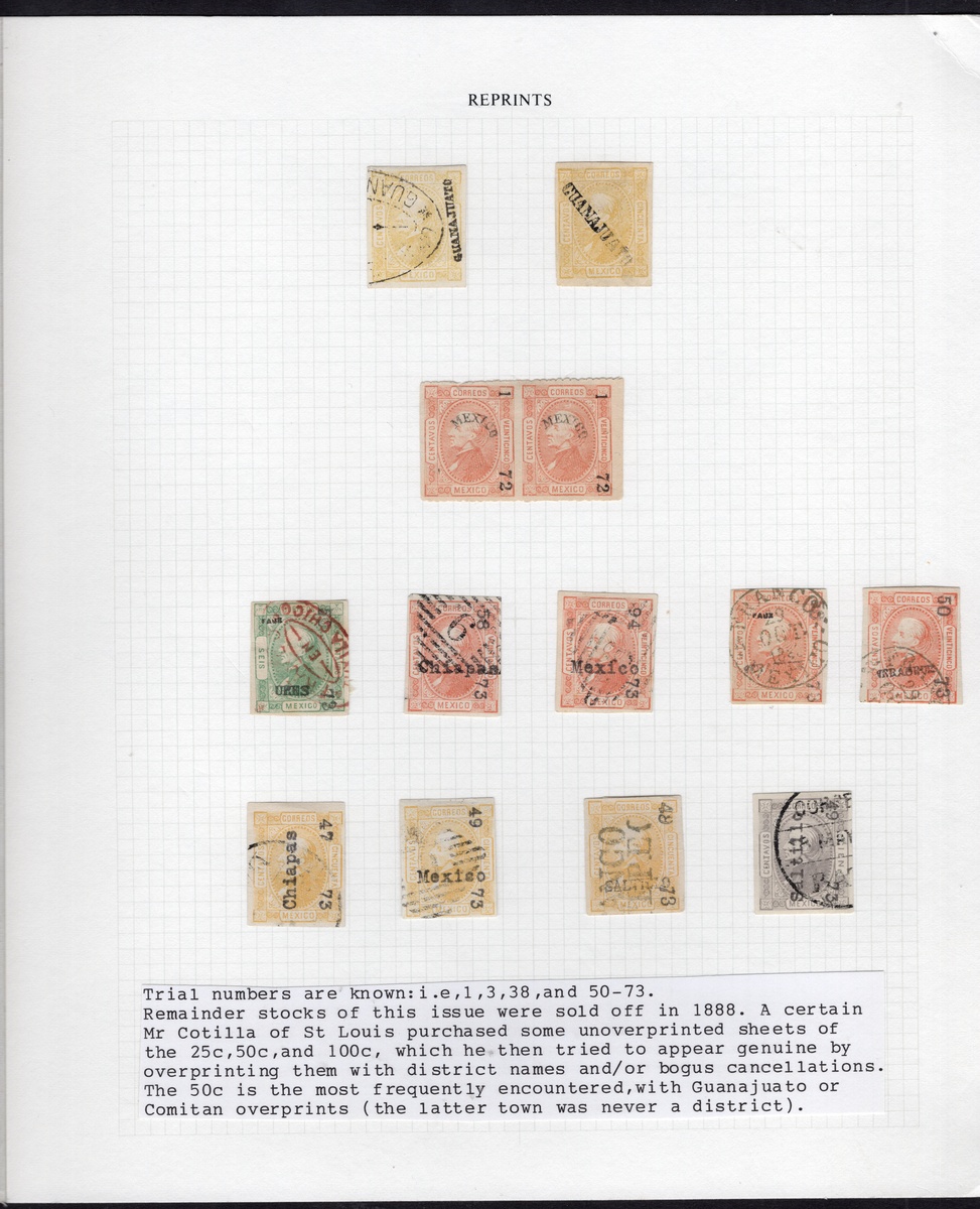 232 Used   imageMexico. 1872 "Hidalgos". 1872 Assembly comprising 16 genuine 12c. Blue and 25c. Red, as well as over 40 reprints and other counterfeits of this "Hidalgos" issue, nicely mounted on exhibition papers. The genuine stamps describe the ten types in detail and include varieties, such as "Juggling with the Ball" and the Smeth/Fayolle Retouch of the letters "TA"., (Image) (Image2) (Image3) (Image4) (Image5) (All Images)