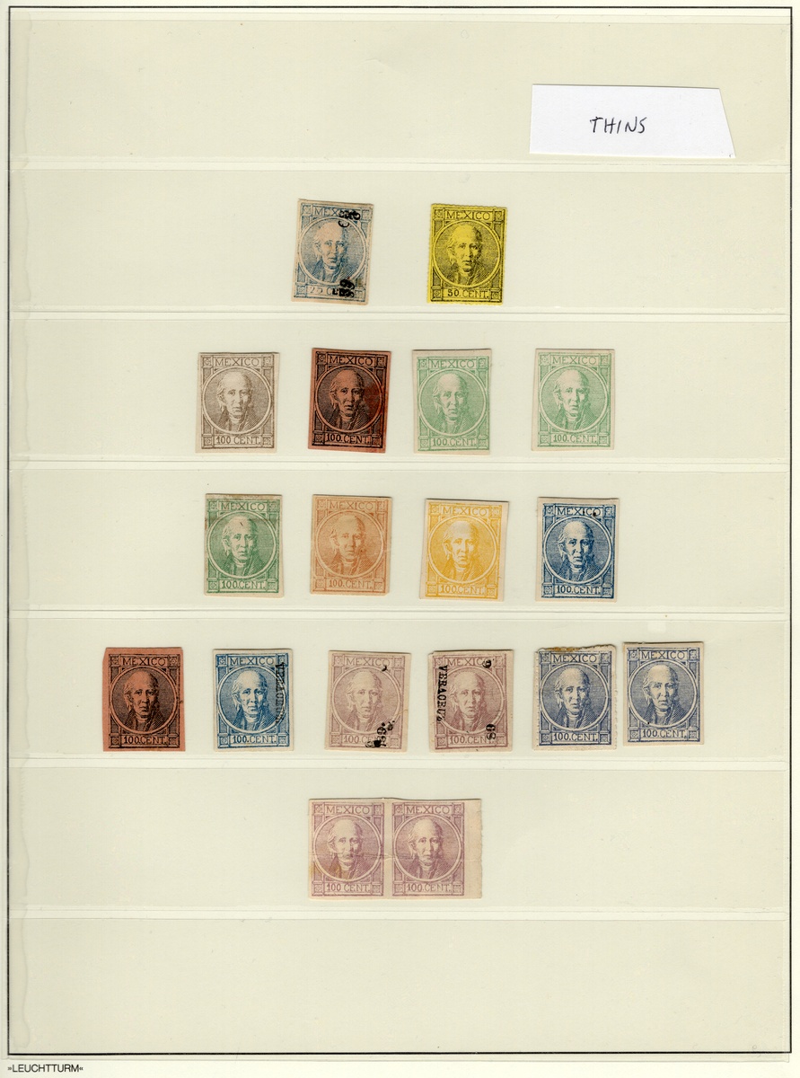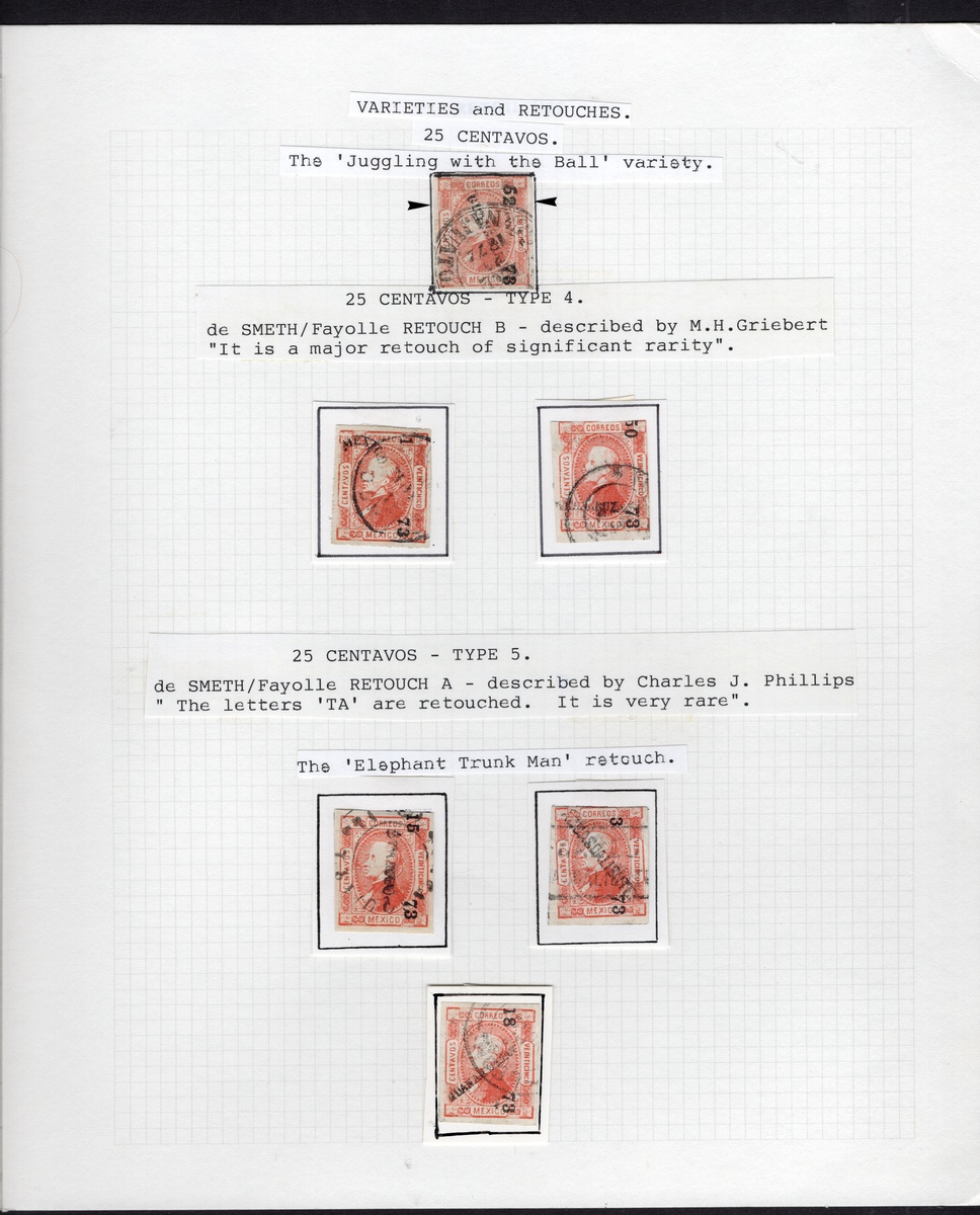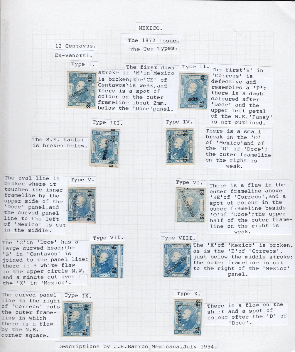 232 Used   imageMexico. 1872 "Hidalgos". 1872 Assembly comprising 16 genuine 12c. Blue and 25c. Red, as well as over 40 reprints and other counterfeits of this "Hidalgos" issue, nicely mounted on exhibition papers. The genuine stamps describe the ten types in detail and include varieties, such as "Juggling with the Ball" and the Smeth/Fayolle Retouch of the letters "TA"., (Image) (Image2) (Image3) (Image4) (Image5) (All Images)
